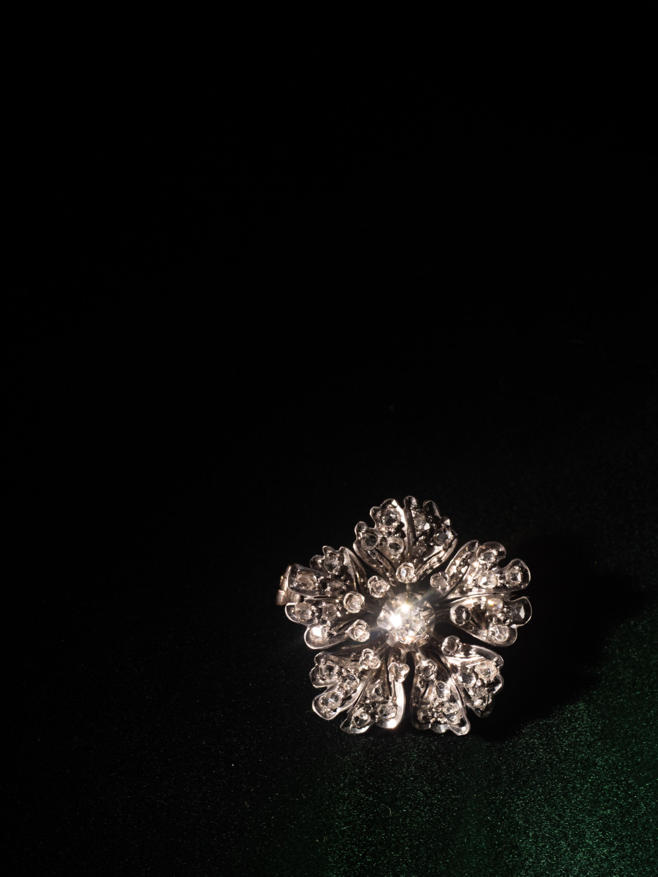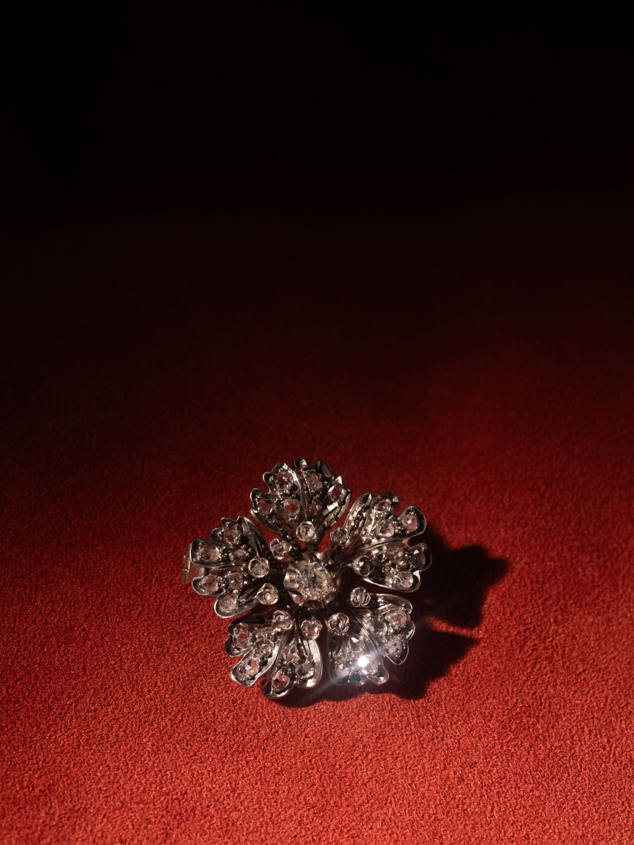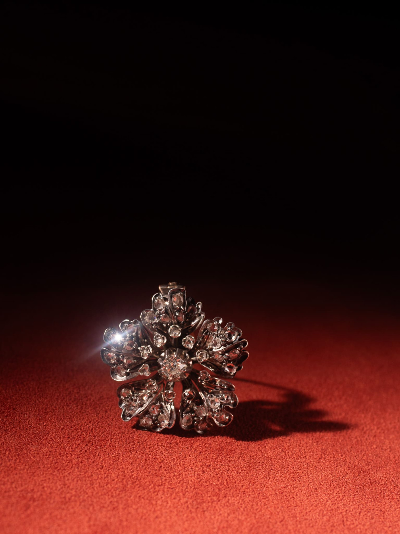 型態流動的花瓣採用開背式鑲嵌鑽石,吸納更多光源增加鑽石的閃耀程度,中心的花蕊則使用毛莨造型鑲座,與花瓣線條流動的外型相互呼應,強化細節表現的精緻度與結構層次。