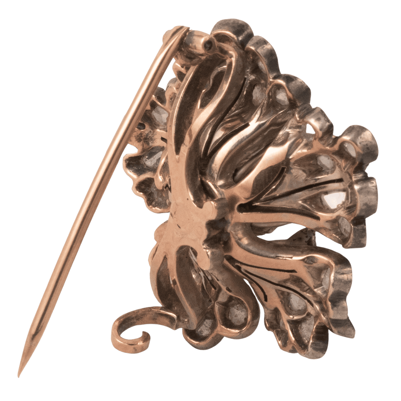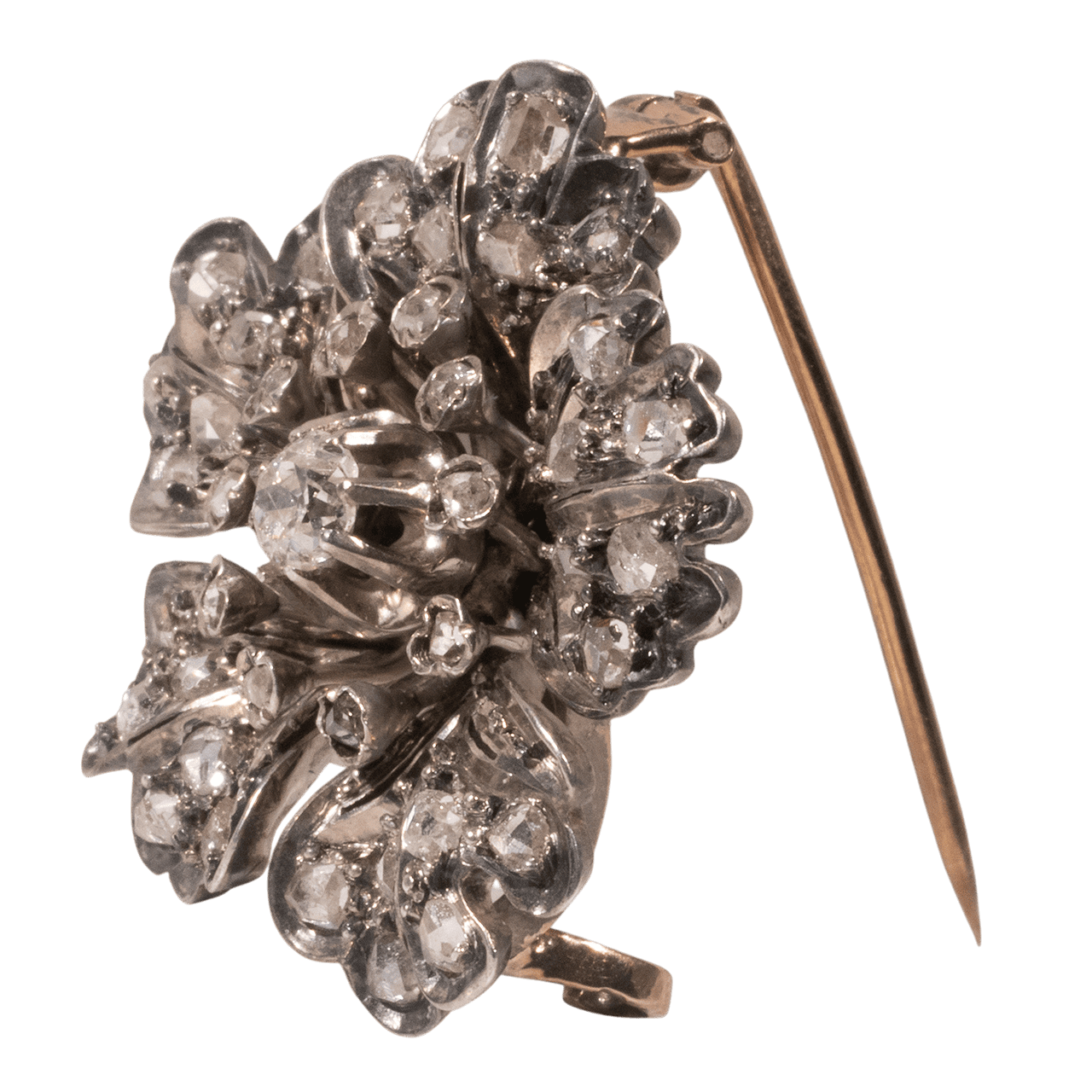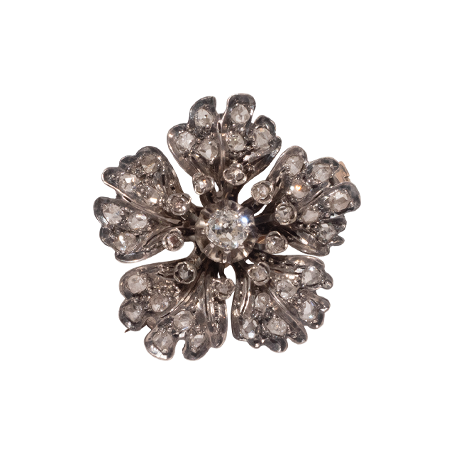 這件法國1880年代的胸針以18k金與純銀打造並鑲嵌鑽石。