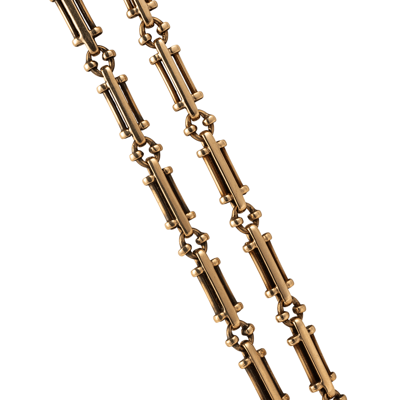 此懷錶鍊的每一節皆為獨立且重複的結構化鍊節,比例一致、節奏清楚,透過精準的連接方式形成連續而穩定的鍊體,具有明確的邊界與重量感。整體設計克制而收斂,使結構本身成為視覺與工藝的主體,亦清楚體現 Interwar period 所帶出的理性與節制。