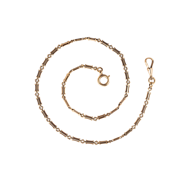 這件奧地利懷錶鍊以 14k 金打造,製作於兩次世界大戰之間(Interwar period)。鍊長 41 公分,帶有奧地利馬首打印(horse head assay mark),可將製作年代界定於約 1922–1930 年代。