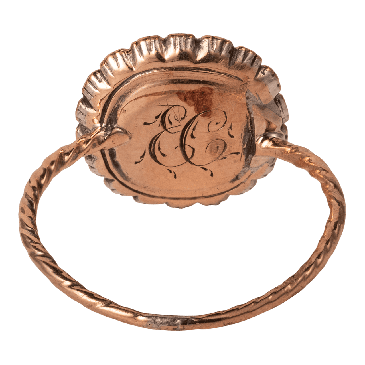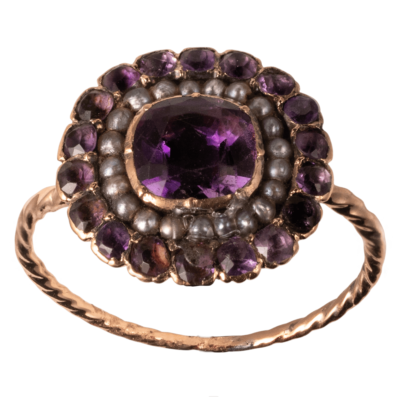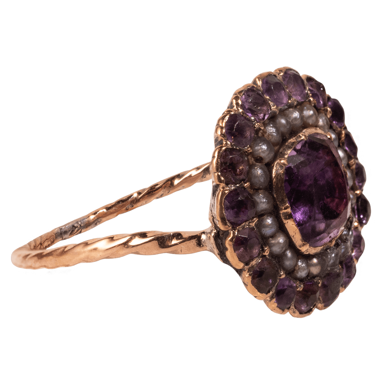 戒指中心鑲嵌一顆老式切割(old-cut)紫水晶,外圍環繞一圈珍珠,最外圈則為一圈較小的老式切割紫水晶。所有紫水晶皆為手工切割,尺寸上的些微差異營造出排列節奏的變化,呈現該時期珠寶製作的典型特徵。分層配置在視覺上建立起由內而外的節奏,中心強調深度、內圈以珍珠帶來柔和的過渡,外圍則透過色彩重新界定輪廓,收攏整體構圖。