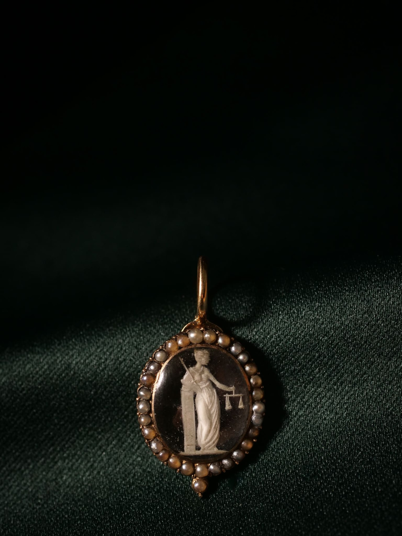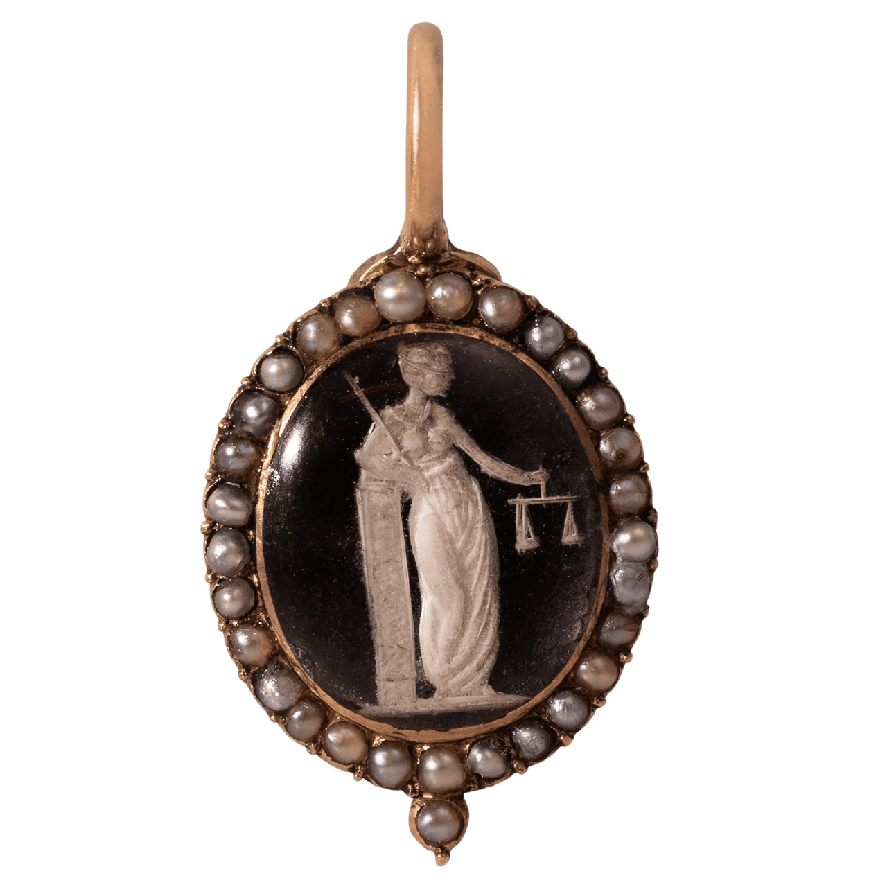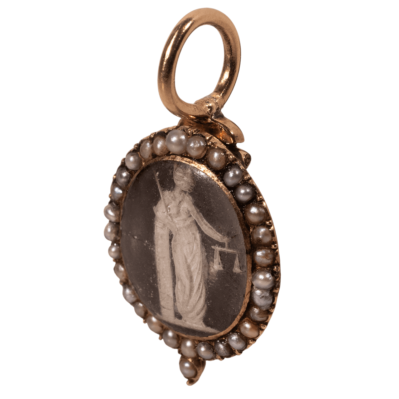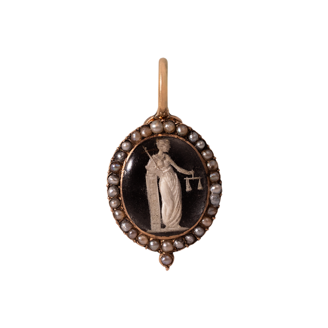 這件英國 19 世紀前半葉的可開啟式吊墜,主體以 10k 金打造(含金比例 42.3%),銜接結構(joint)使用 14k 金(含金比例 60.9%),墜頭為 18k 金(含金比例 71.6%)。正面為 Justitia 主題的反向雕刻水晶(reverse crystal intaglio,商業名稱 Essex crystal),外圍鑲有一圈小珍珠。
