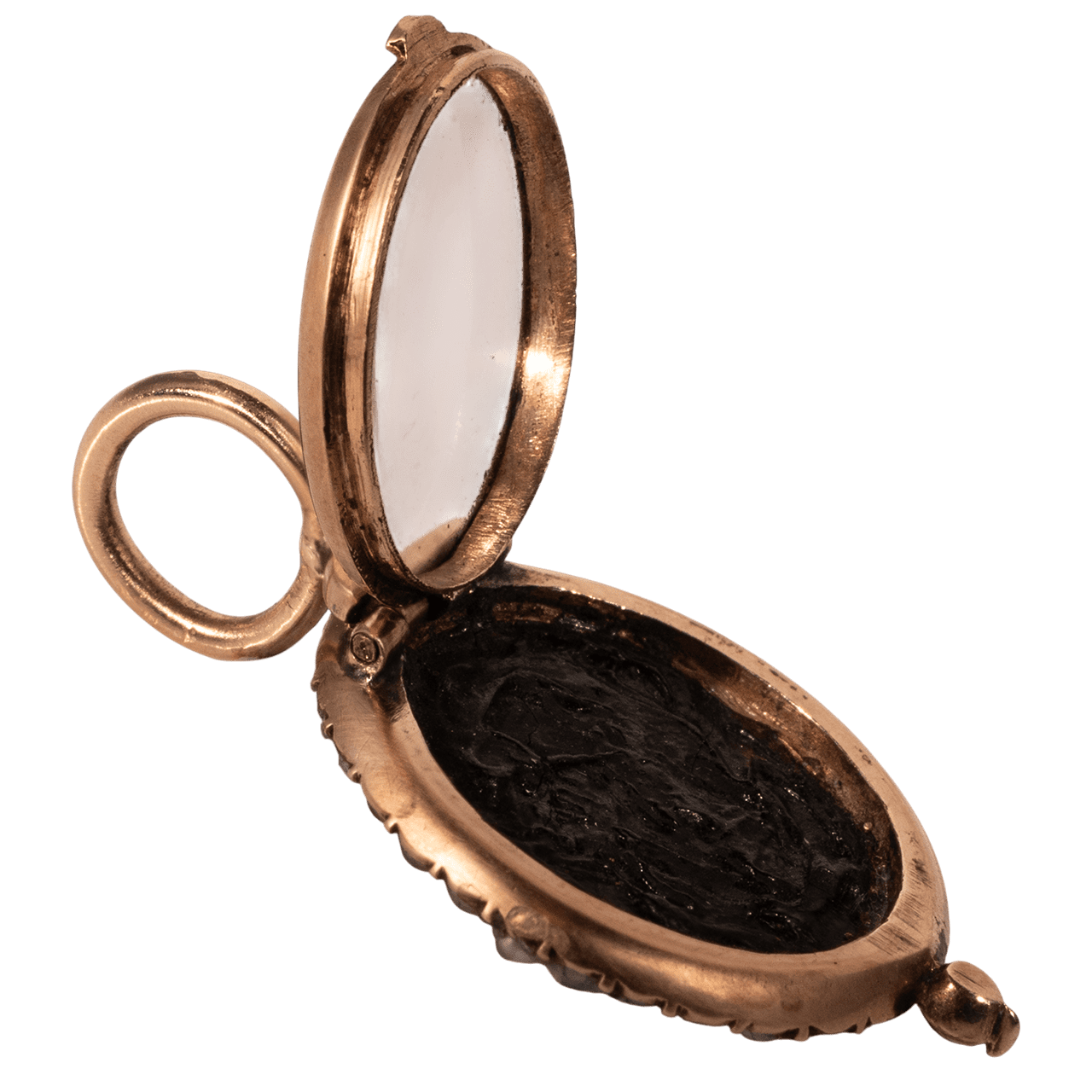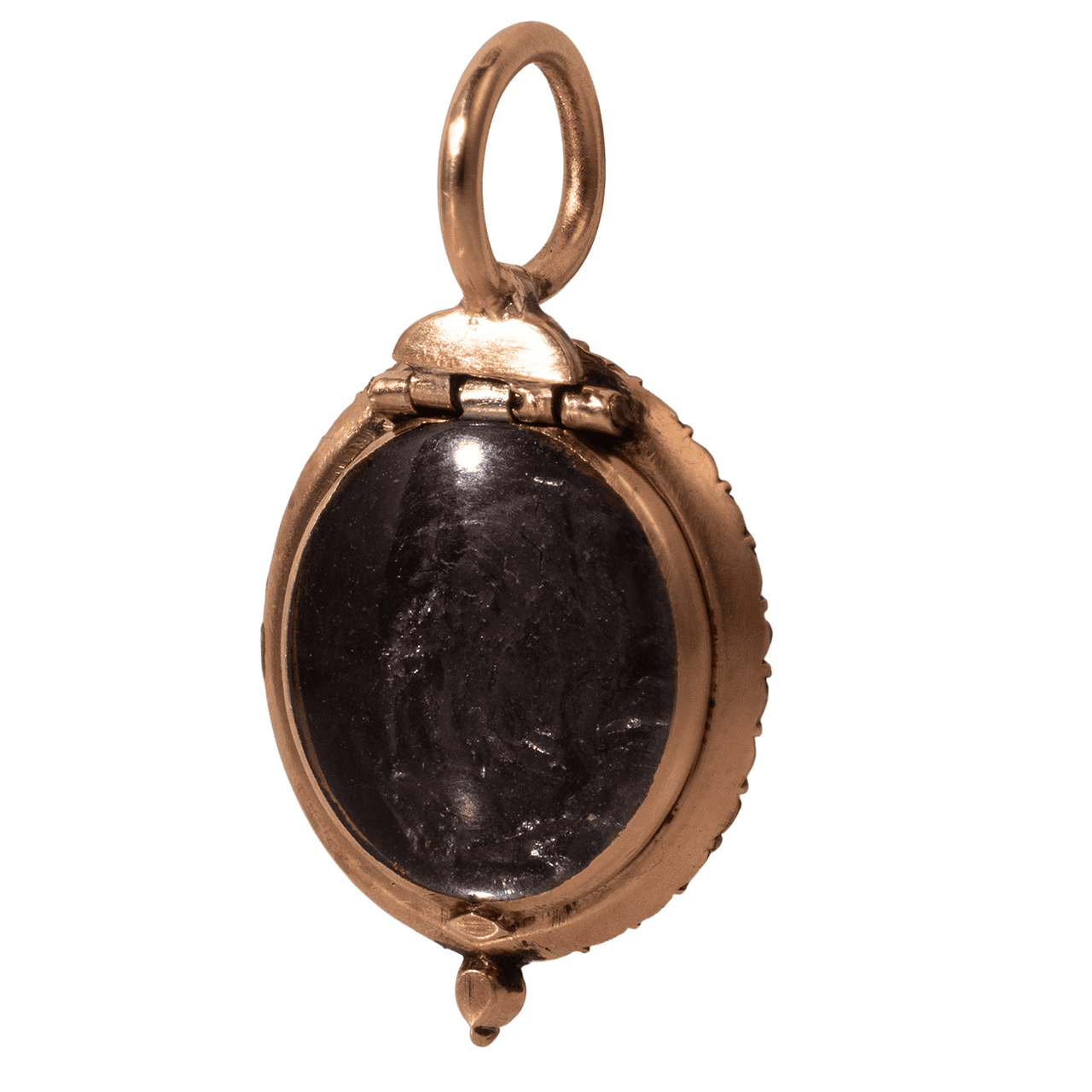 背面為可開啟式結構,屬小型收納吊墜形式。原始墜頭極小,其尺寸比例與連接方式符合 19 世紀常見於 chatelaine(腰鏈)系統中的功能性小件特徵;此判斷基於結構觀察,而非保留完整原始佩戴系統之證據。