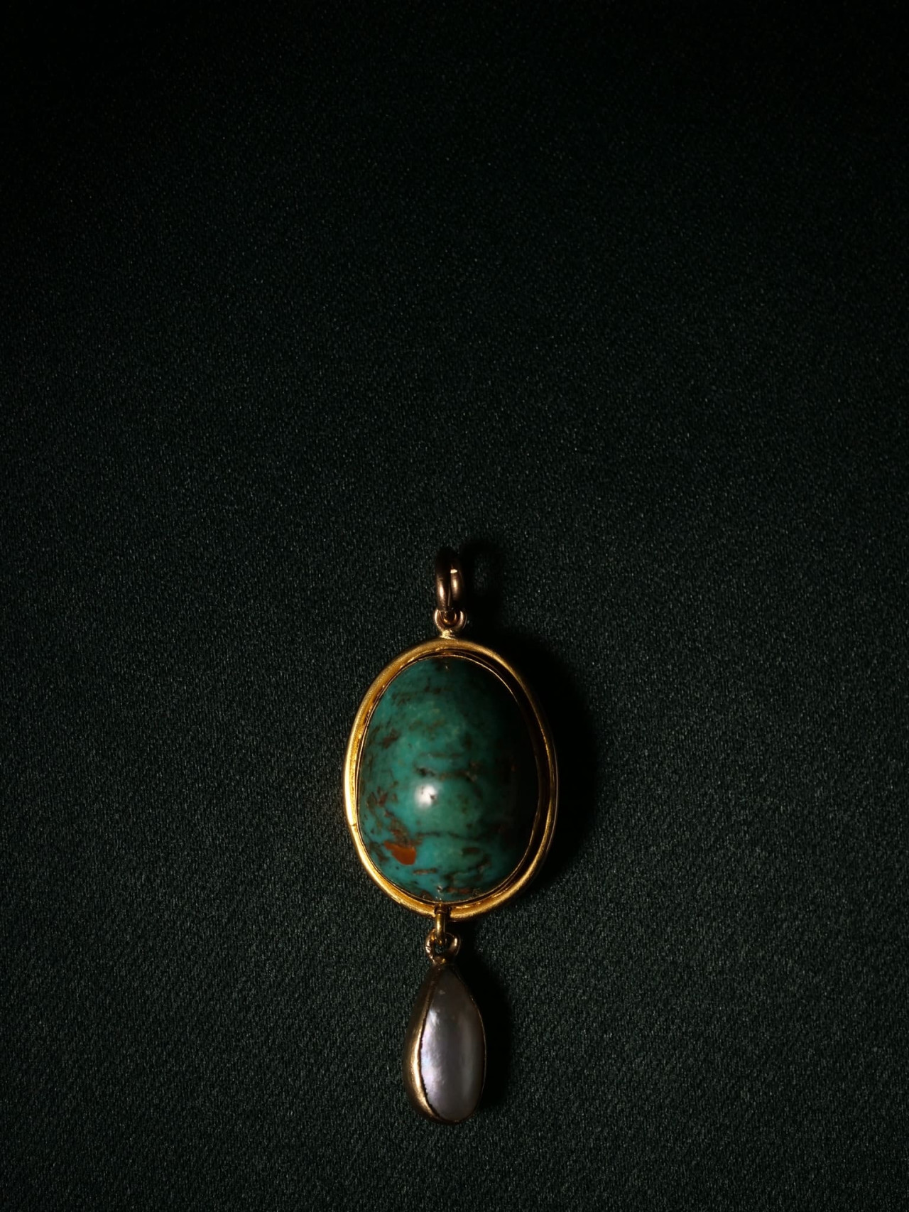吊墜主體鑲嵌一顆橢圓形蛋面切割(cabochon)綠松石。厚實且輪廓明確的邊框展現出手工製作的質樸線條,簡潔的設計使視覺焦點集中於綠松石本身。珠母貝呈不規則水滴狀,黃金邊框順應珍珠本身的形態貼合輪廓打造。