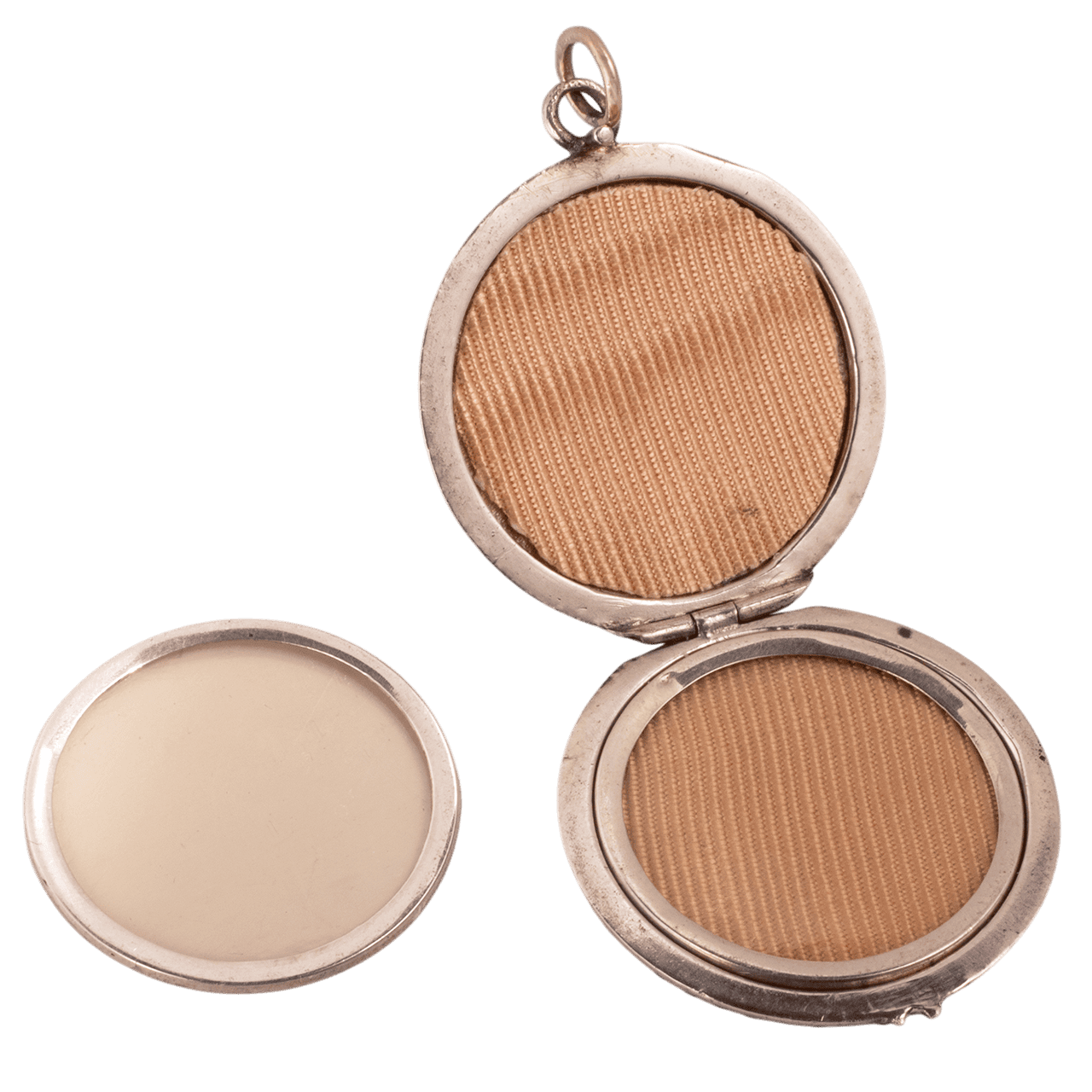這只英國1890-1900年代的相片墜以純銀打造,以浮雕琺瑯(Guilloché)與火燒琺瑯技法裝飾,鑲嵌玻璃石(paste),內部有雙面夾層。