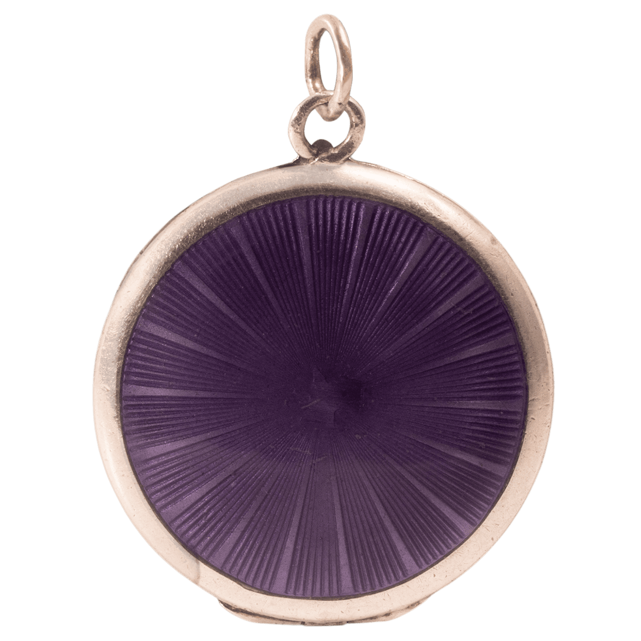 相片墜背面則是另一種工藝美學—浮雕琺瑯(guilloché enamel)。此技藝結合了機械精密與工匠的經驗,浮雕花紋雖由玫瑰車床或直線車床雕刻而成,但整個過程必須由工匠親手操作,靠手感與經驗精確掌握壓力與節奏。這不是按下按鈕的機器作業,而是一刀一刀雕出的節奏與光影。細密的底層紋路完成後,再以紫色琺瑯層燒結覆蓋在幾何紋理之上,當光線穿透琺瑯便映照出金屬底紋。