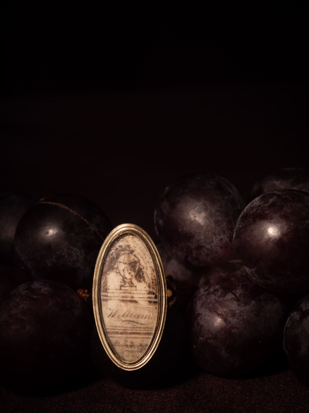 這枚戒指以細筆描繪出一株垂柳、一座骨甕,以及“William”這個名字。垂柳(weeping willow)在西方文化中是悲傷的象徵,柔軟的枝條如同低首哭泣的人影。自新古典主義時期起,垂柳常被用以隱喻死亡與永恆的思念,成為哀悼藝術中最溫柔的象徵。