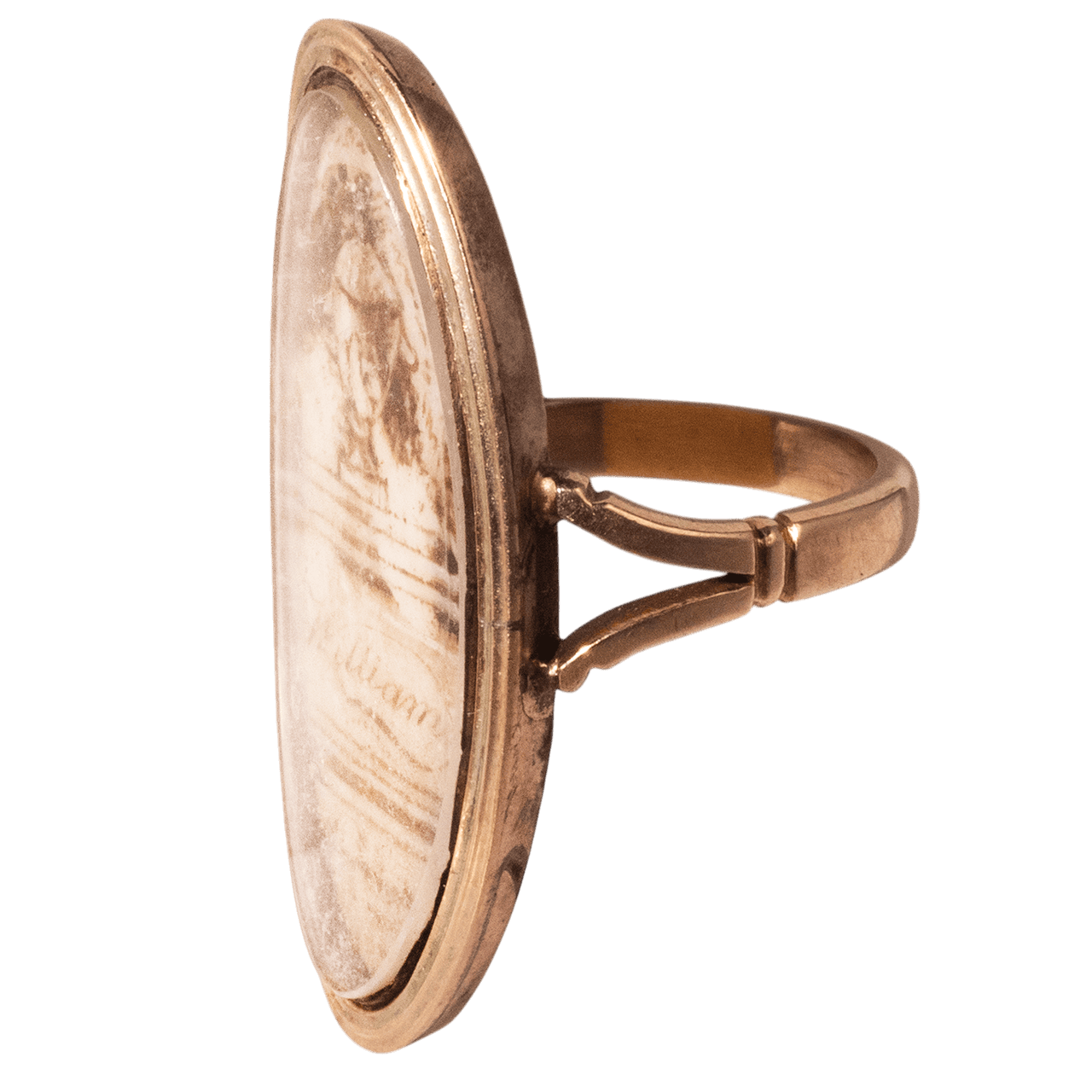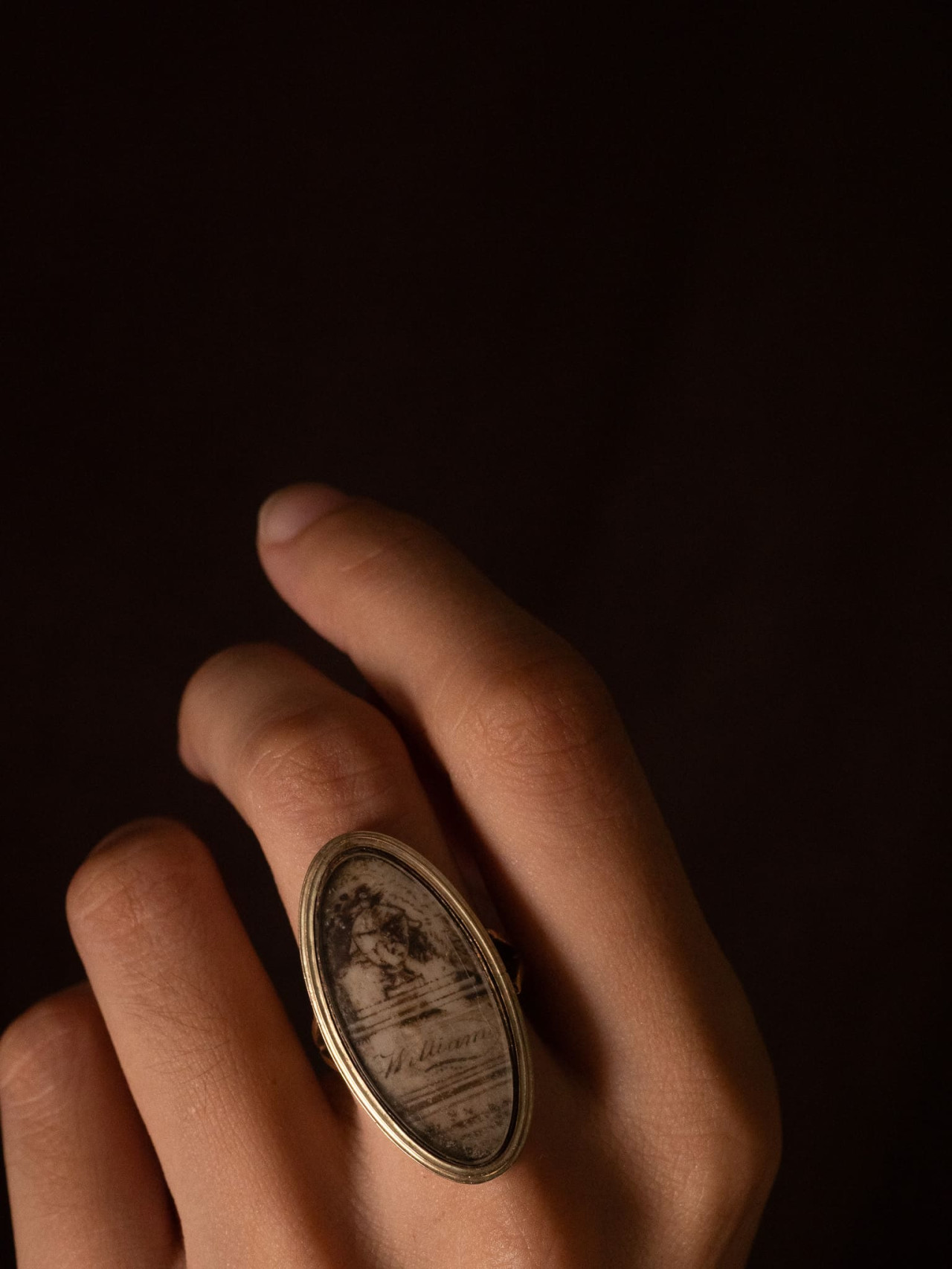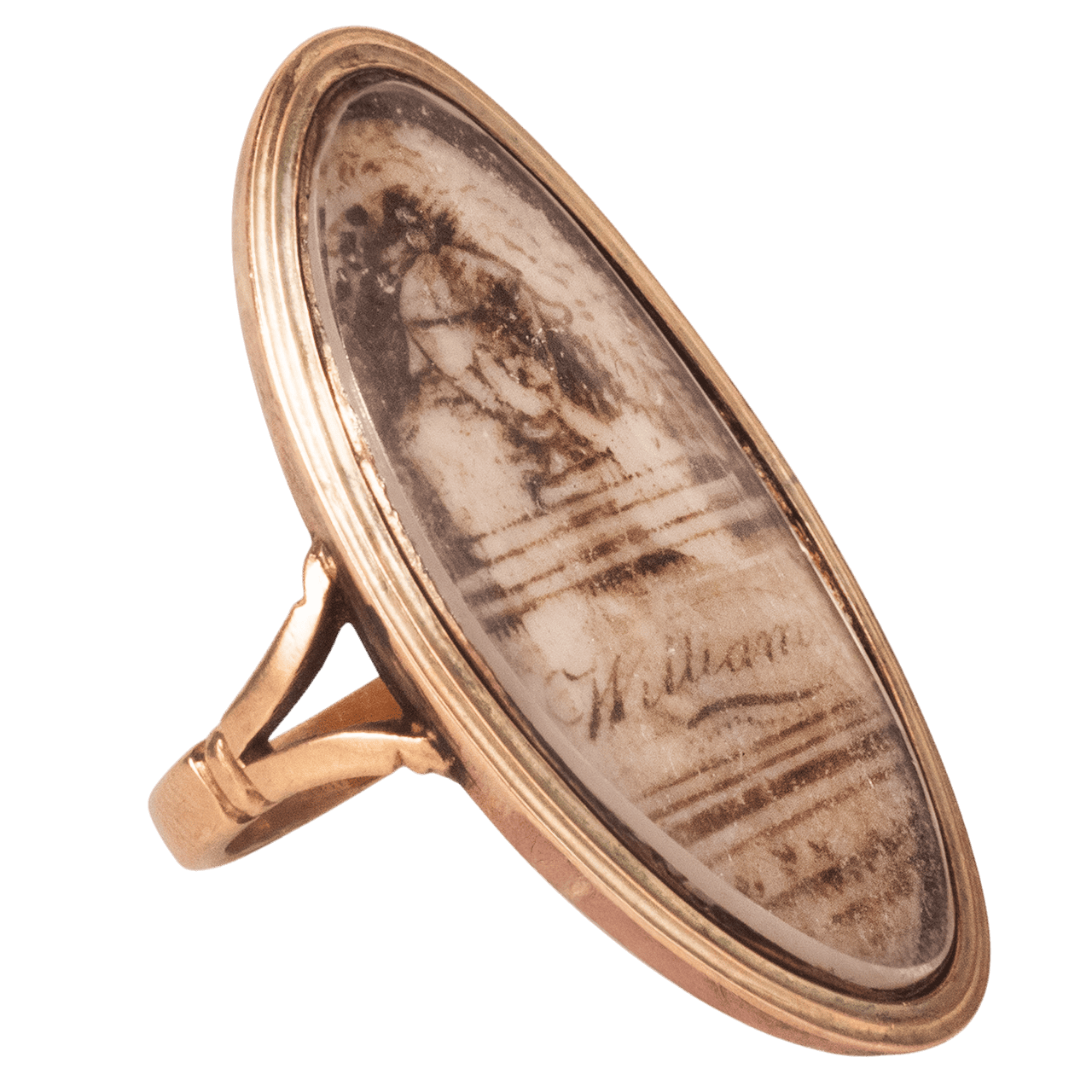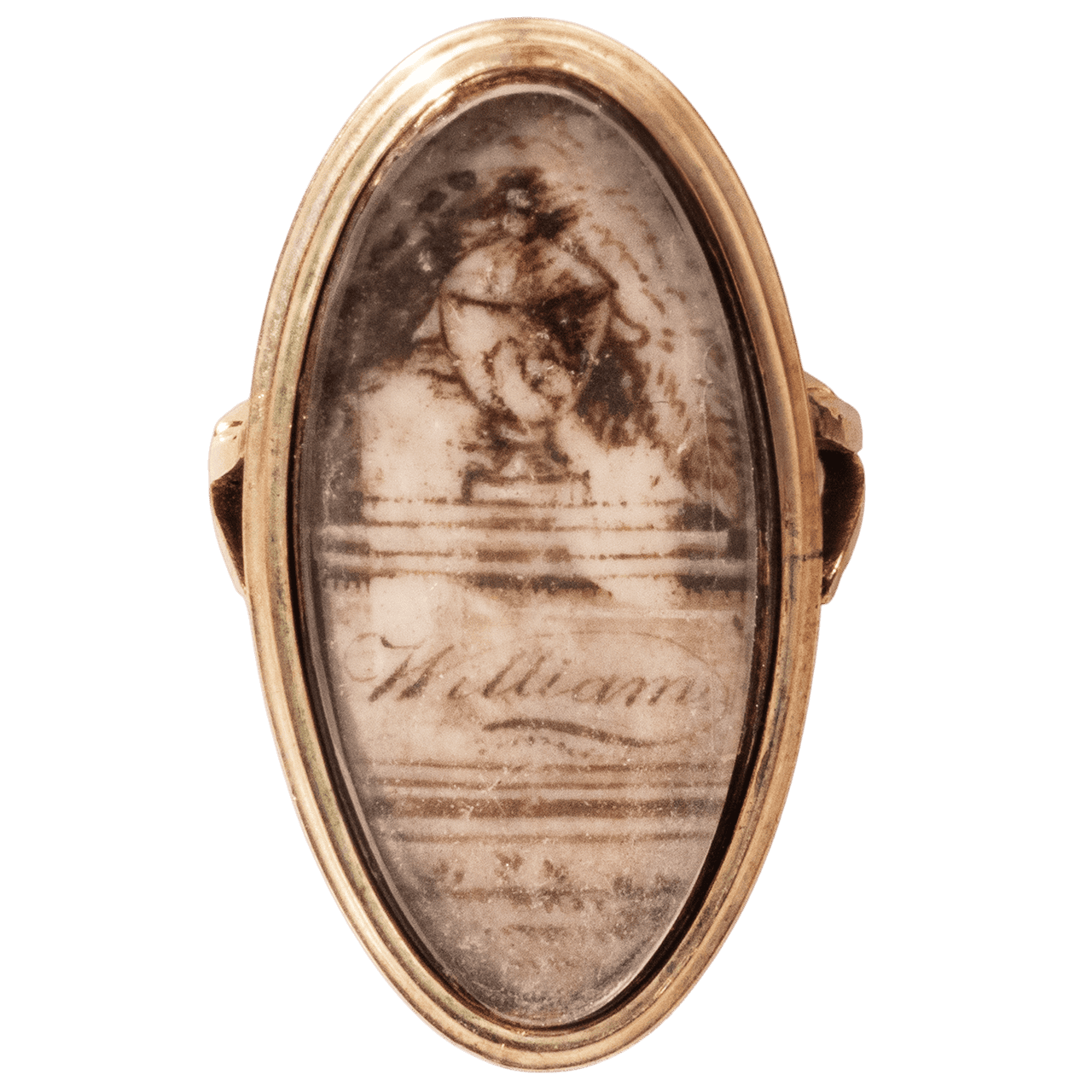 這枚英國十八世紀晚期的哀悼戒指以9k金打造,骨質面上以棕褐色墨水(sepia)細緻手繪出柳樹、骨甕與姓名「William」的構圖。