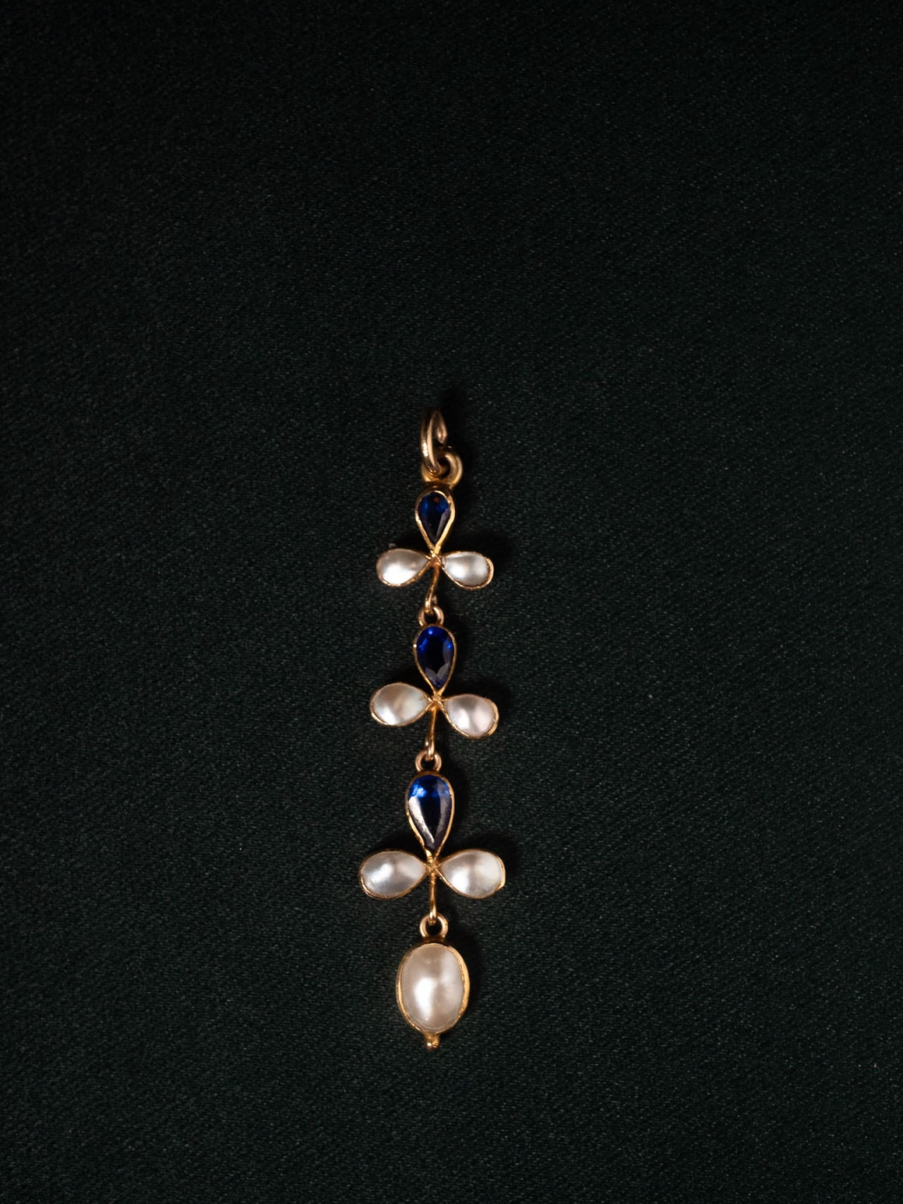 作品以連續的三葉形(trefoil)構圖串接而成:每一節上方為水滴形寶藍色玻璃石,下方則以兩片水滴形珠母貝向左右展開,形成三瓣式的抽象輪廓。藍色玻璃的通透與濃度,與珠母貝柔和的虹彩形成清楚對比,使修長的垂墜結構在節奏上更有層次。末端再以一枚橢圓形珠母貝作收束,讓整體線條更完整。