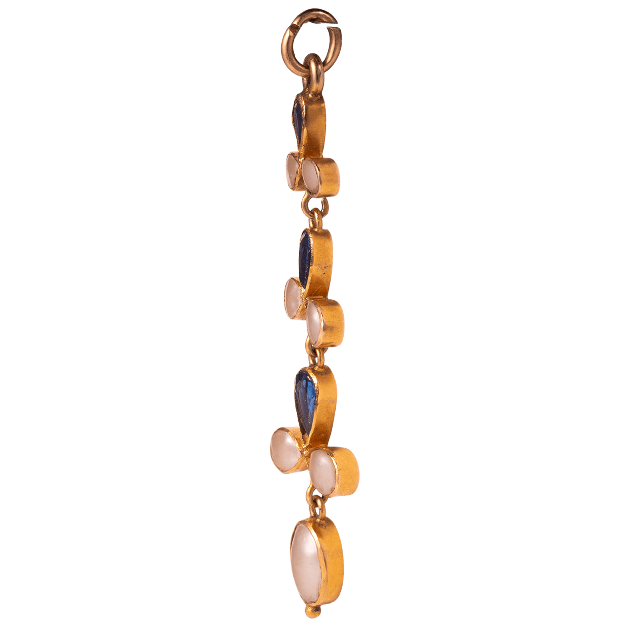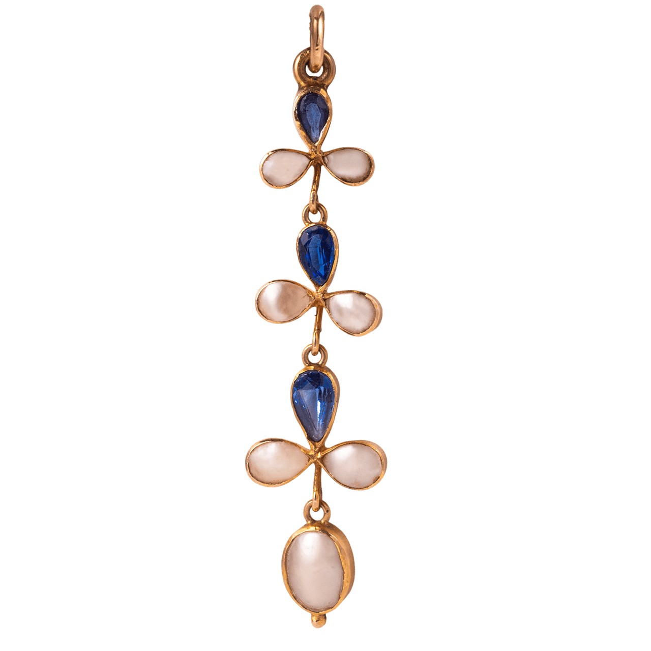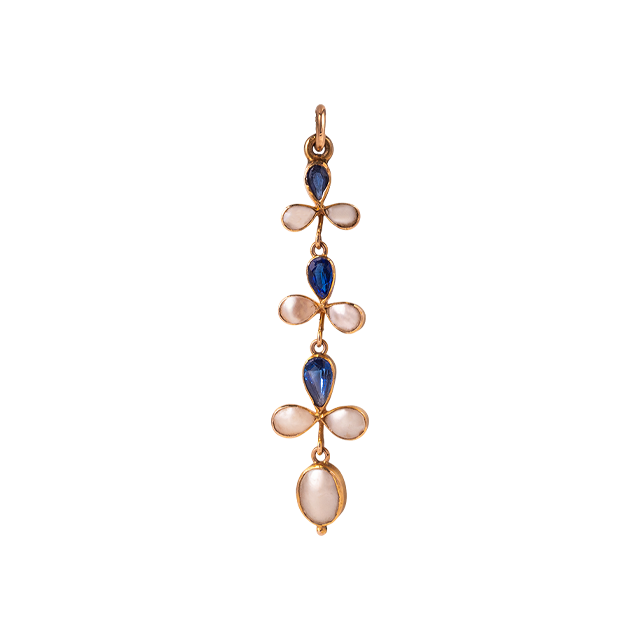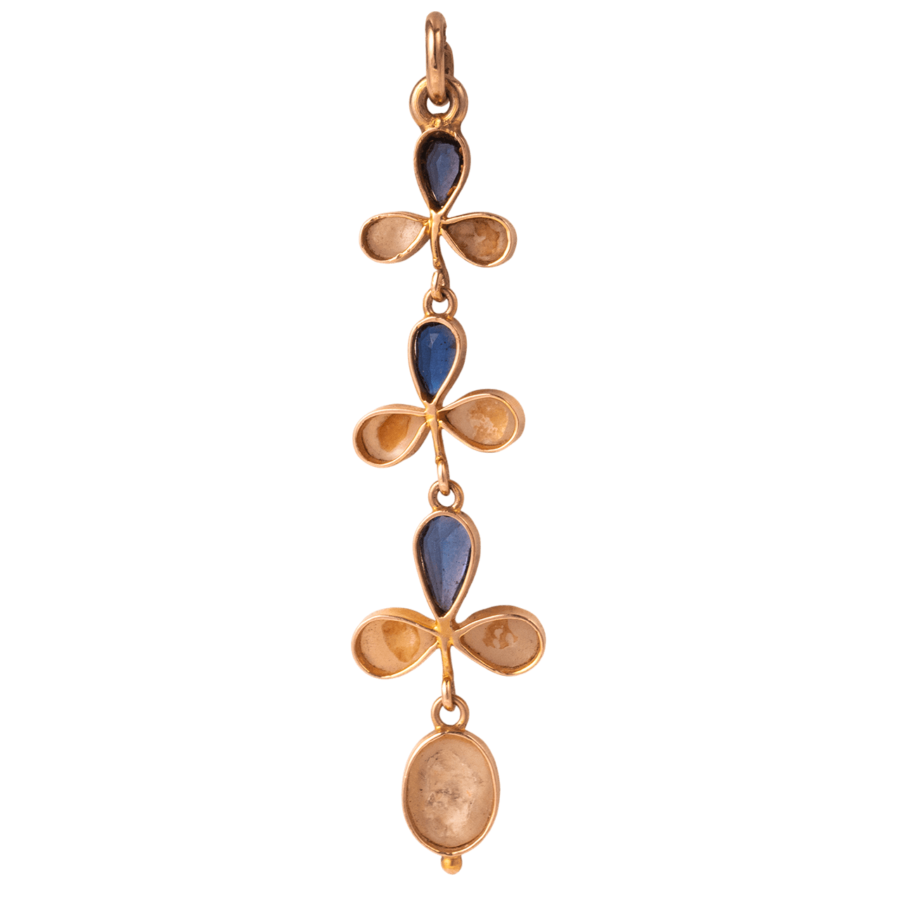 這件英國 1900 年代的吊墜以 14k 金打造(含金比例 58.6%),鑲嵌珠母貝以及藍色玻璃石(paste)。