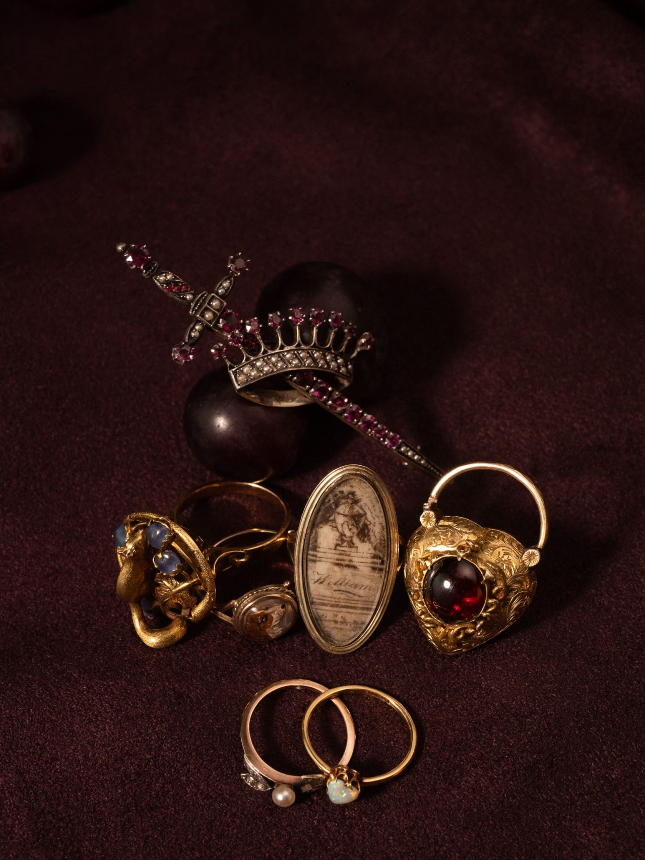 在古董珠寶的象徵符碼中,寶劍代表勇氣、守護,以及權力(武力)的掌握,皇冠則是王權、忠誠與正統的表現。當兩者結合,將皇冠放在武器之上,表達的是「武力歸屬於王權並受其統御」,是具有愛國與榮譽的軍徽語彙,表達對王權的忠誠與對服役者的紀念。