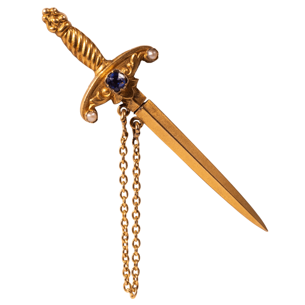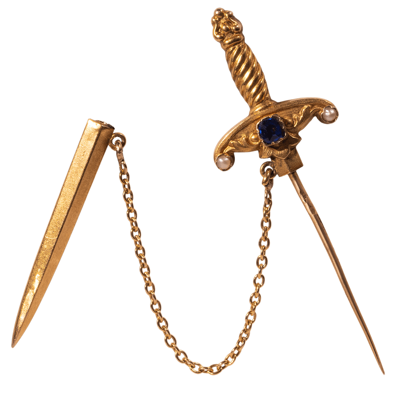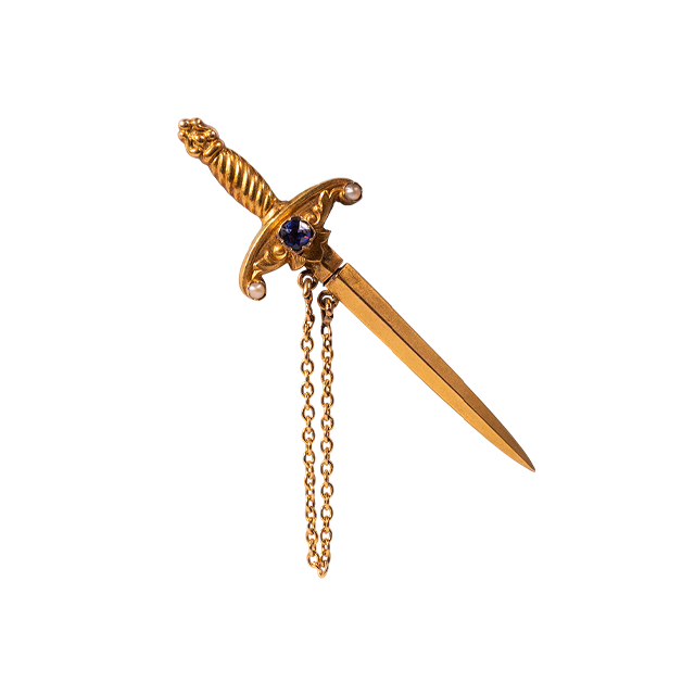 胸針所鑲嵌的藍色寶石為一枚 夾層石(GTD,garnet topped doublet),以石榴石薄片覆蓋於底部有色玻璃之上。石榴石薄層提供較彩色玻璃更佳的硬度與表面耐用性;依底層顏色不同,可用以模擬各色寶石。此類夾層石為十九世紀後期歐洲珠寶中成熟且被廣泛接受的寶石工藝之一。