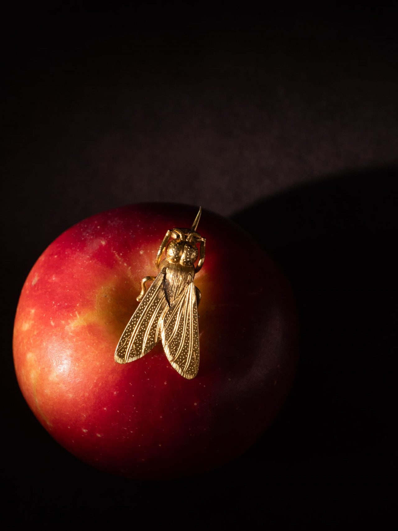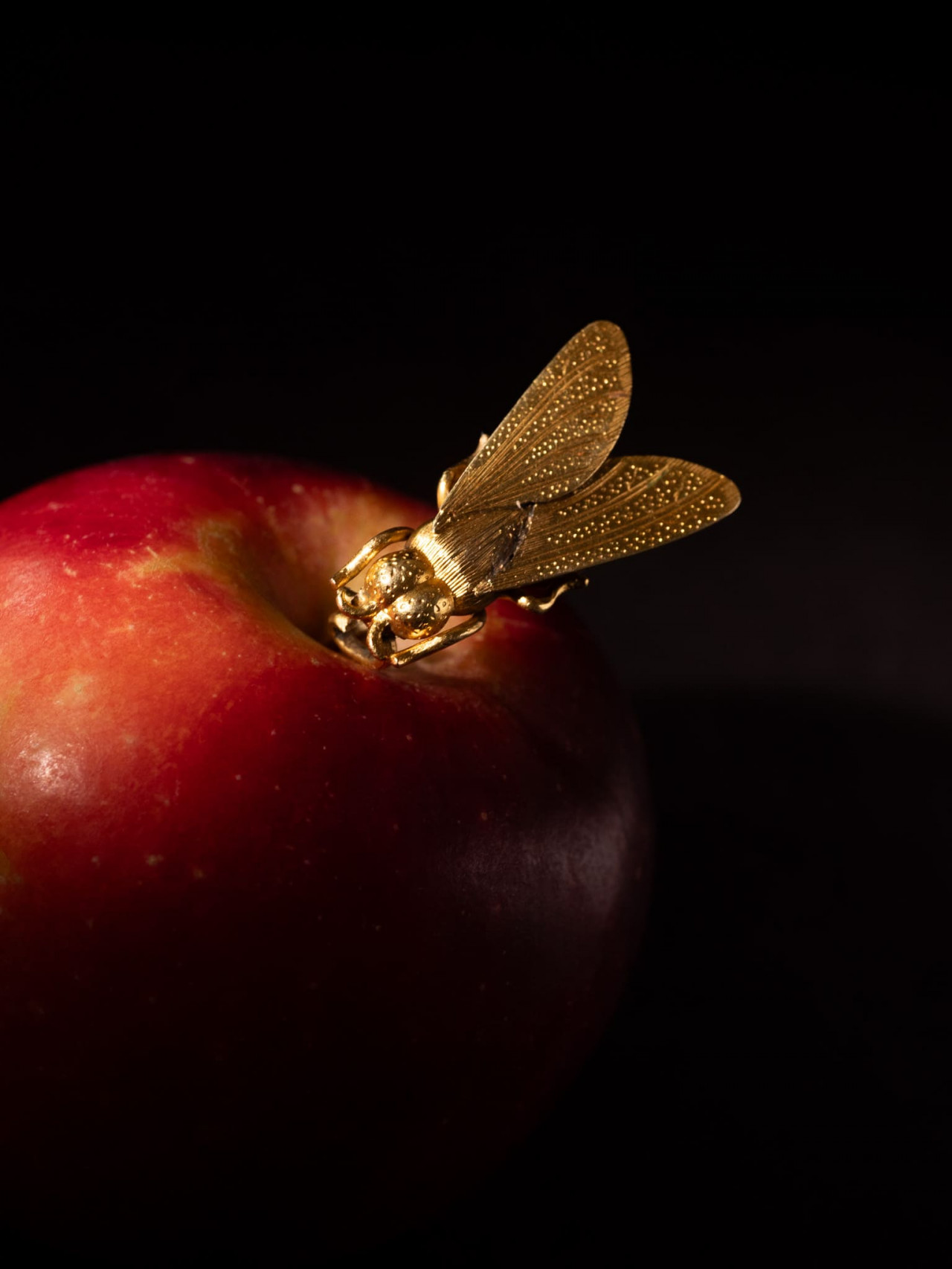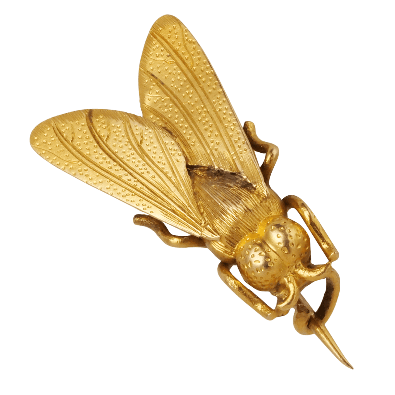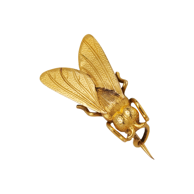 蒼蠅在維多利亞時代被賦予「執著」、「吸引力」等多重象徵,也因昆蟲的生命週期短暫,而有提醒人們生命短暫且須珍惜的含義。珠寶匠人透過細緻金工,將自然界的微觀生命轉化為具象設計,呼應當時浪漫感性的珠寶特色與自然主義表現並存的文化背景,進而成就這件融合自然科學與人文工藝的昆蟲珠寶。