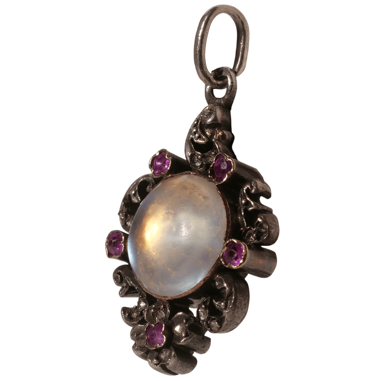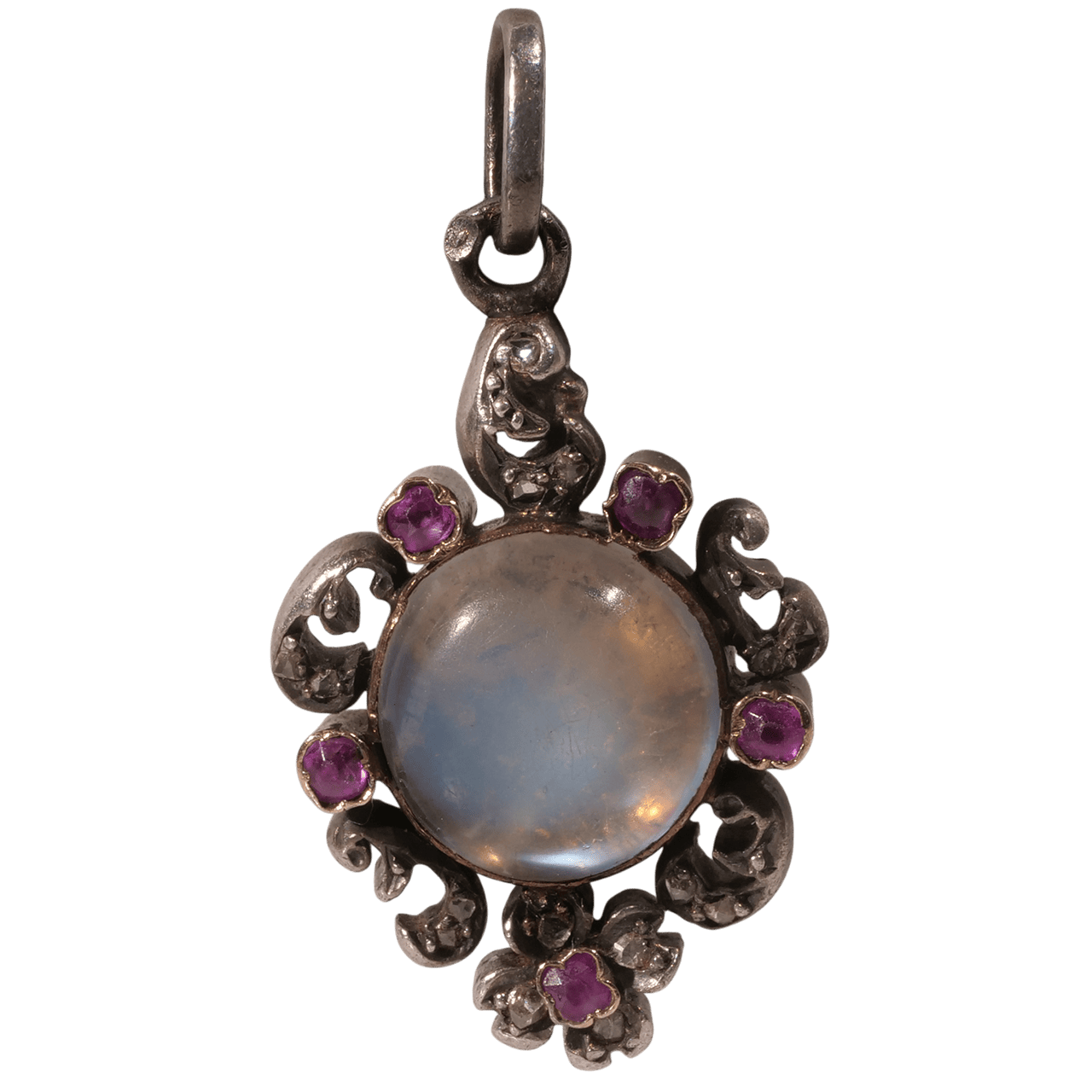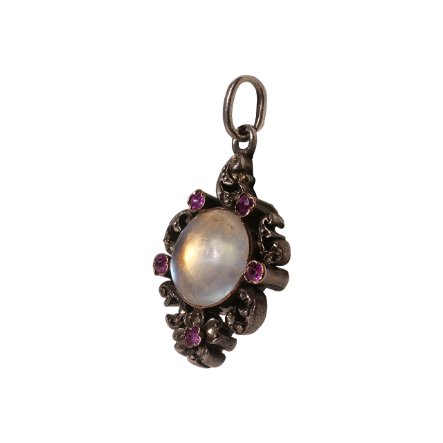 這件法國 1850 年代浪漫主義時期的吊墜以 18k 金與銀打造,鑲嵌月光石與粉紅色藍寶石(經檢測)。