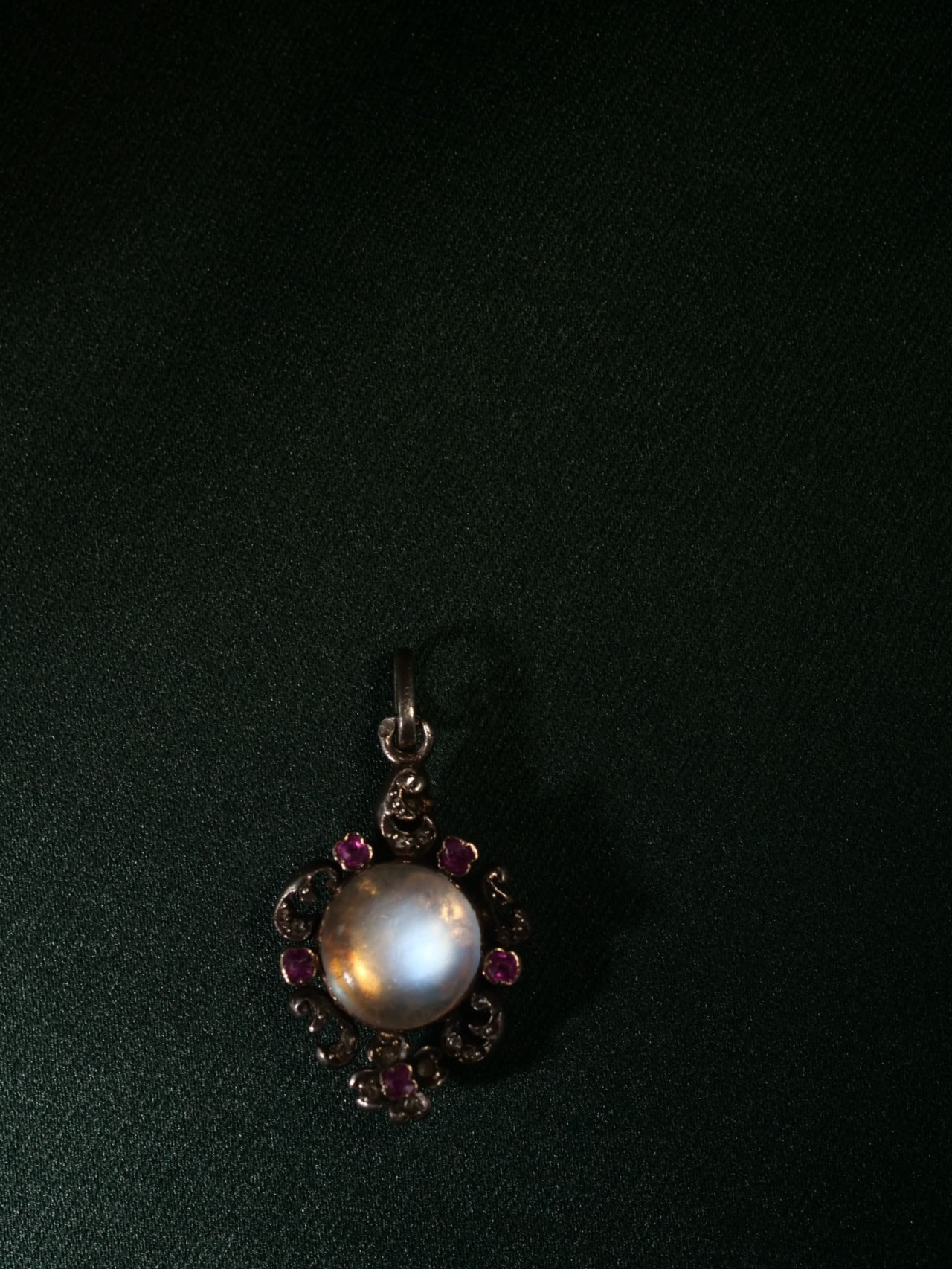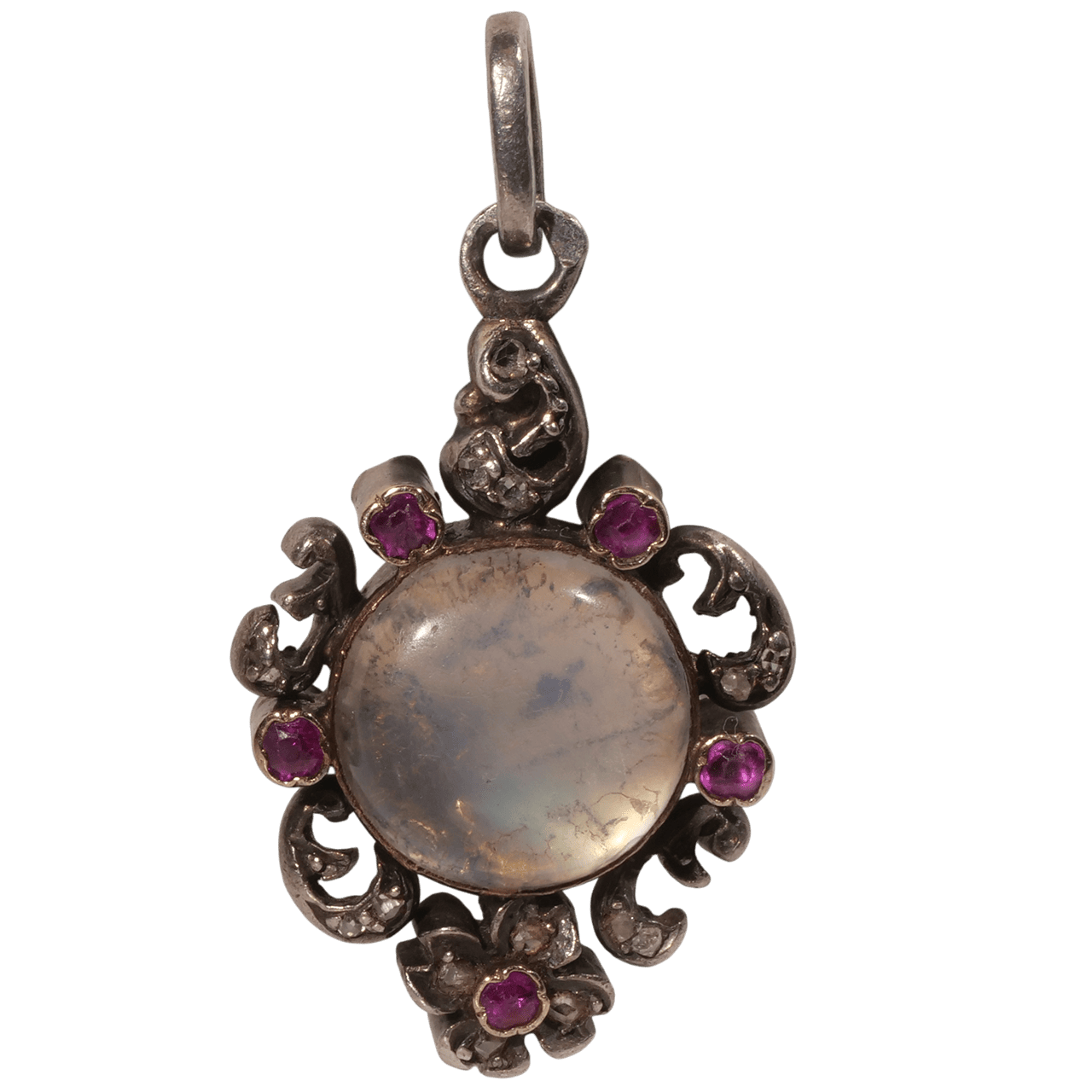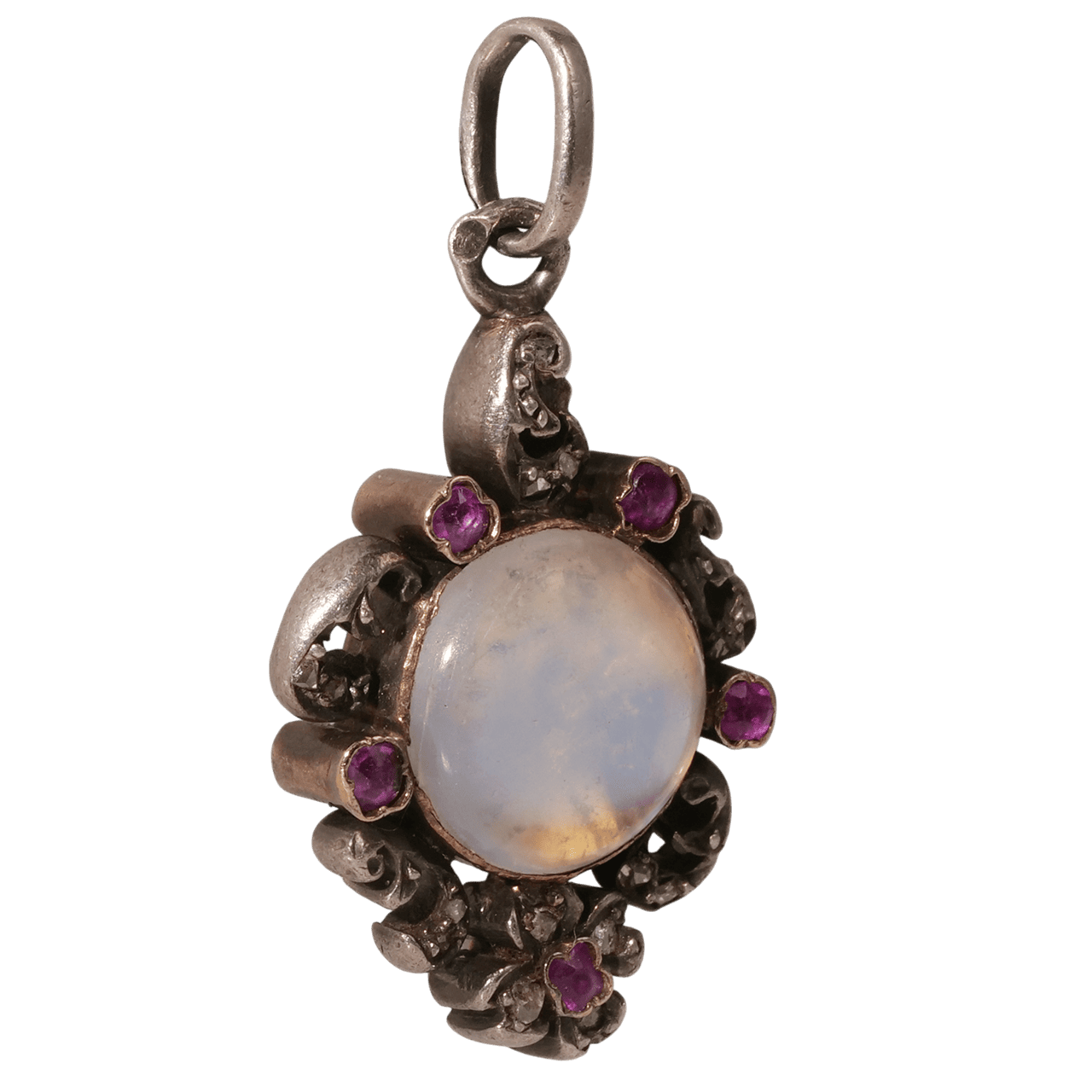 這件法國 1850 年代浪漫主義時期的吊墜以 18k 金與銀打造,鑲嵌月光石與粉紅色藍寶石(經檢測)。