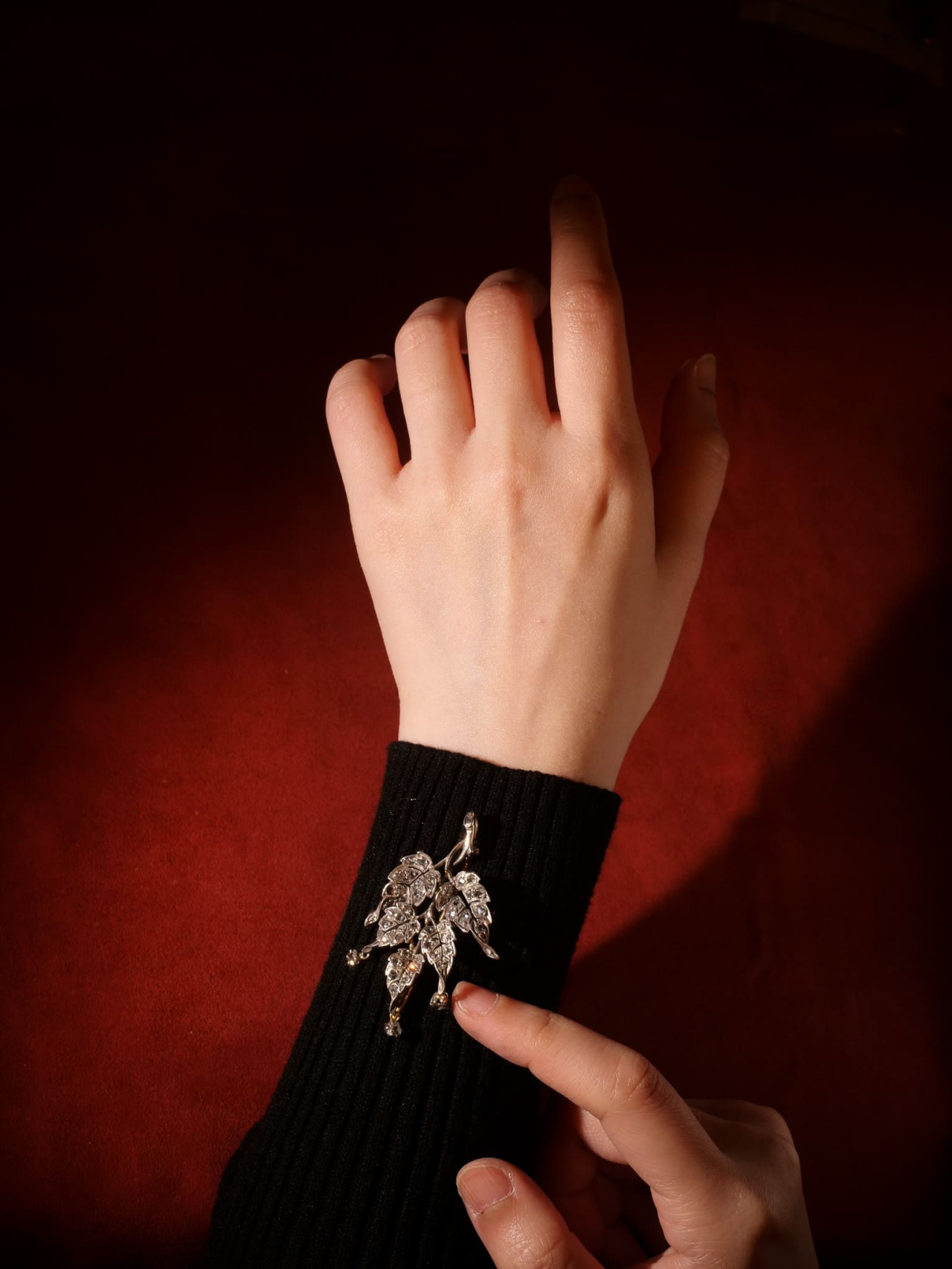 葉面下方懸掛三枚單顆鑽石,形成如露滴般的垂墜效果。垂墜元素延續枝葉向下伸展的結構邏輯,也在自然晃動時帶來光線變化。