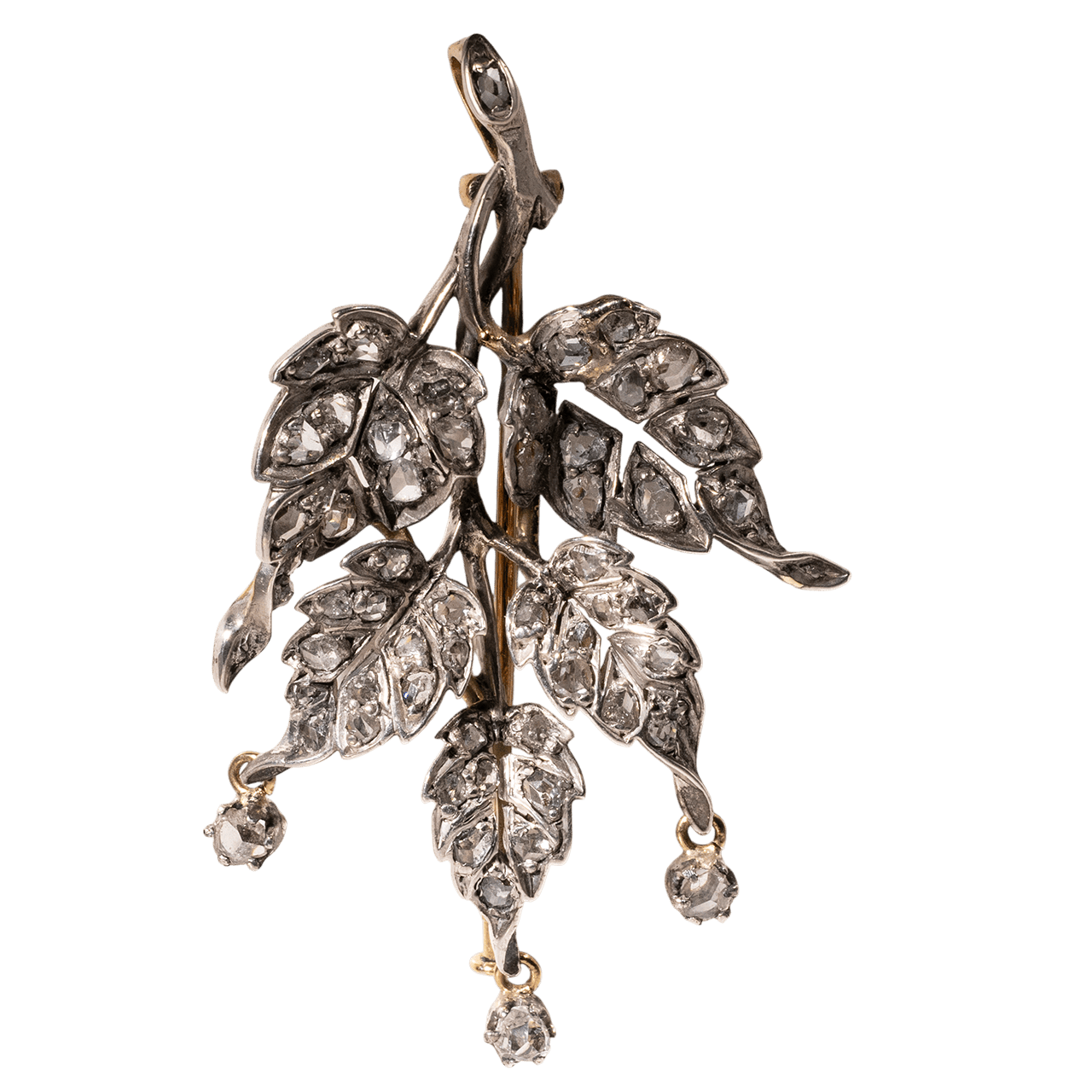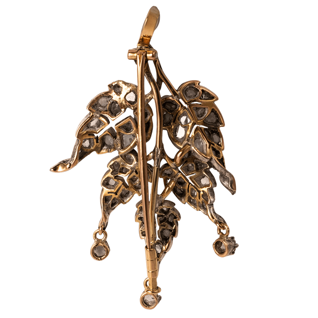 作品整體以黃金打造,表面覆銀並採開背式鑲嵌。造型延續 19 世紀自然主義風格,整體結構依循枝幹向外延展,各葉片的葉脈與葉形處理清晰,並透過起伏的曲面與前後交錯的安排形成具有空間感的立體結構,而非單一平面。