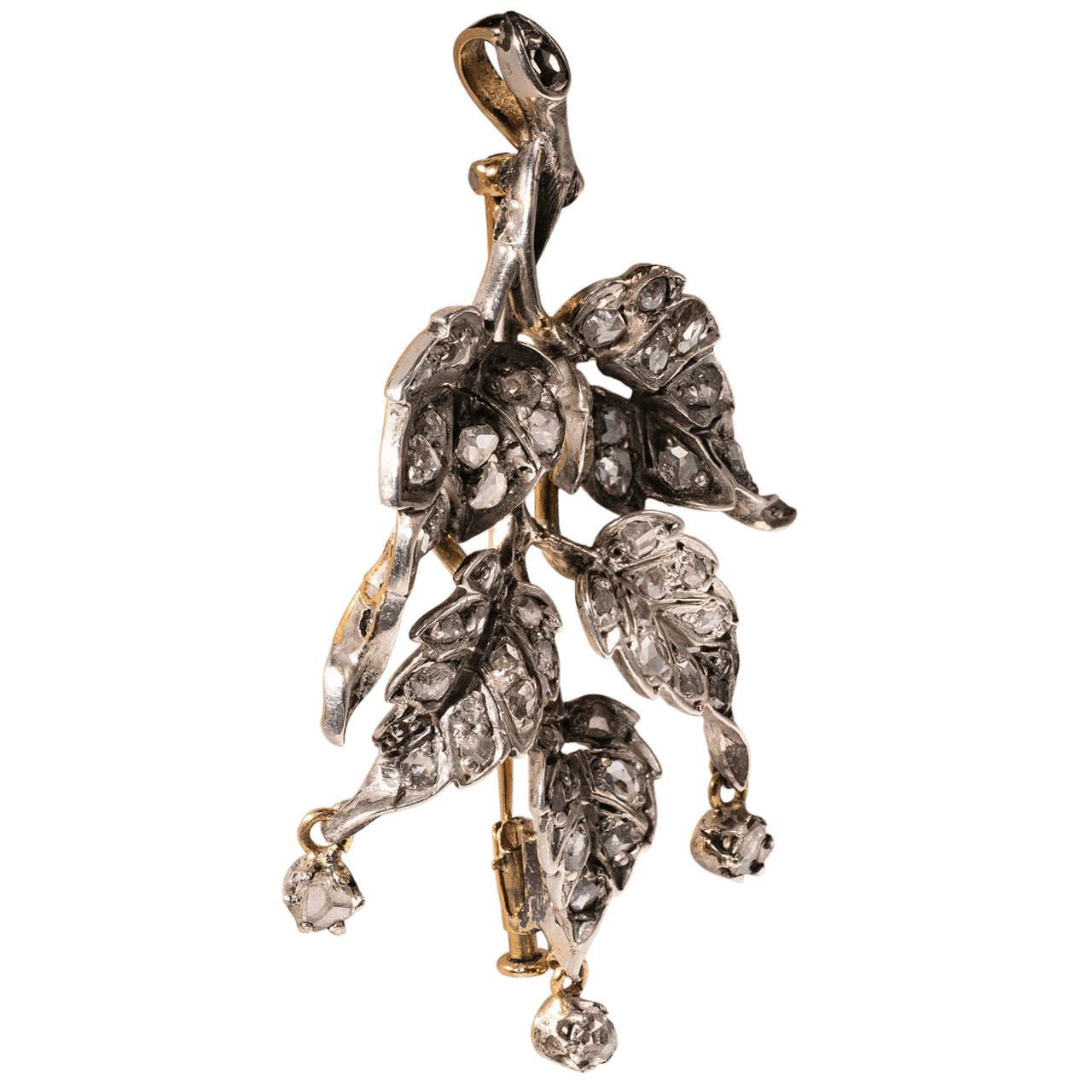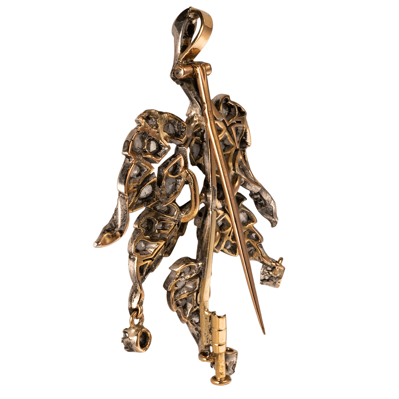 這件法國 19 世紀晚期的胸針以 18k 金與銀製作,鑲嵌鑽石。